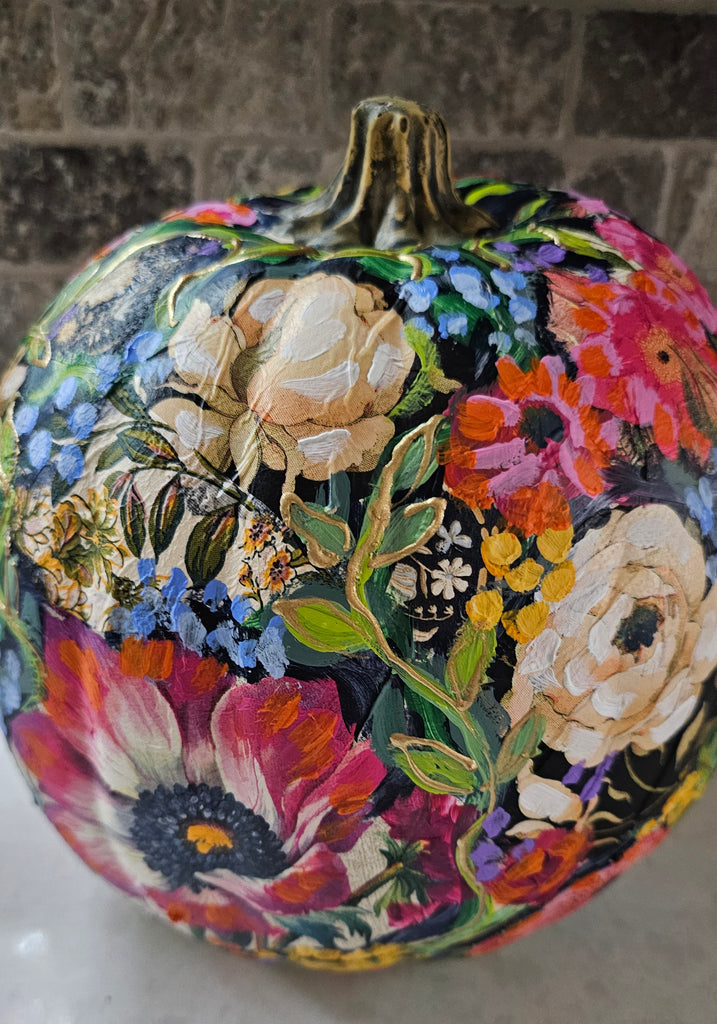This pumpkin is made from collage and original art. It has beautiful texture and is a one of a kind creation.  Its covered with a clear protective coating to preserve it for years to come. Measures 9x9"