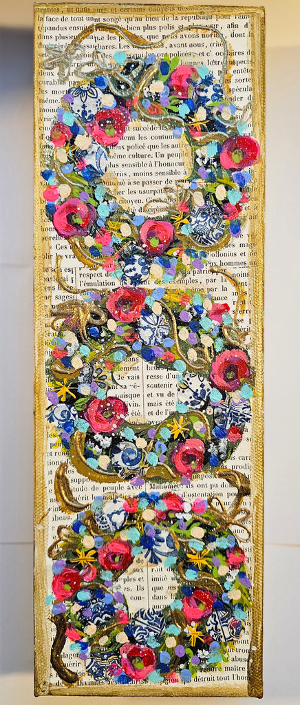 This is an original painting on a 1.5" thick wrapped canvas with painted edges. This can sit on a shelf or be hung. Its made with vintage French literature and is covered with a clear protective coating to preserve it for years to come.  (Photo of 3 is for reference only).