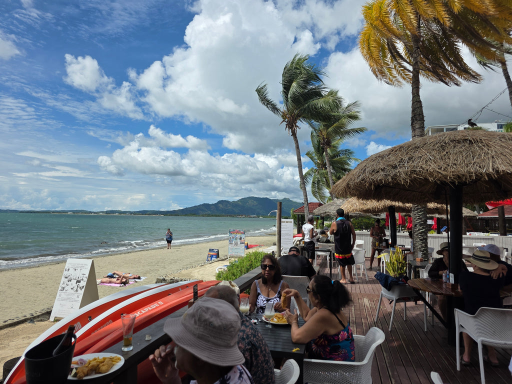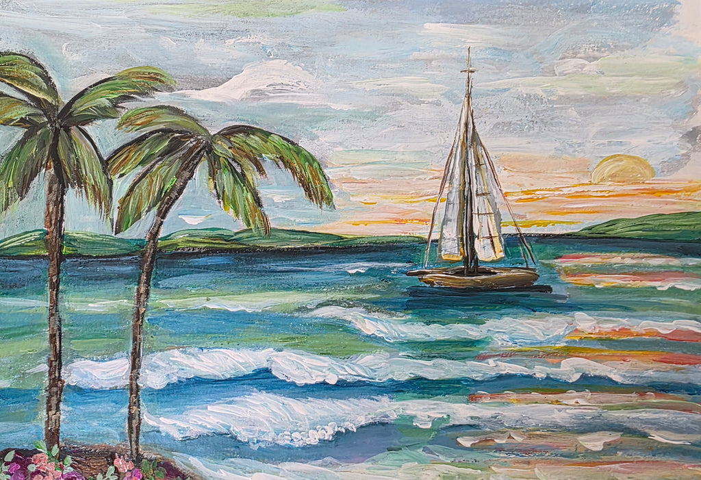 This is an original painting on Fine art paper. It was inspired by my lunch in Nadi, where I enjoyed the mist delicious tropical tea and coconut shrimp on my recent trip to Fiji. It's covered with a clear protective coating to preserve it for years to come.